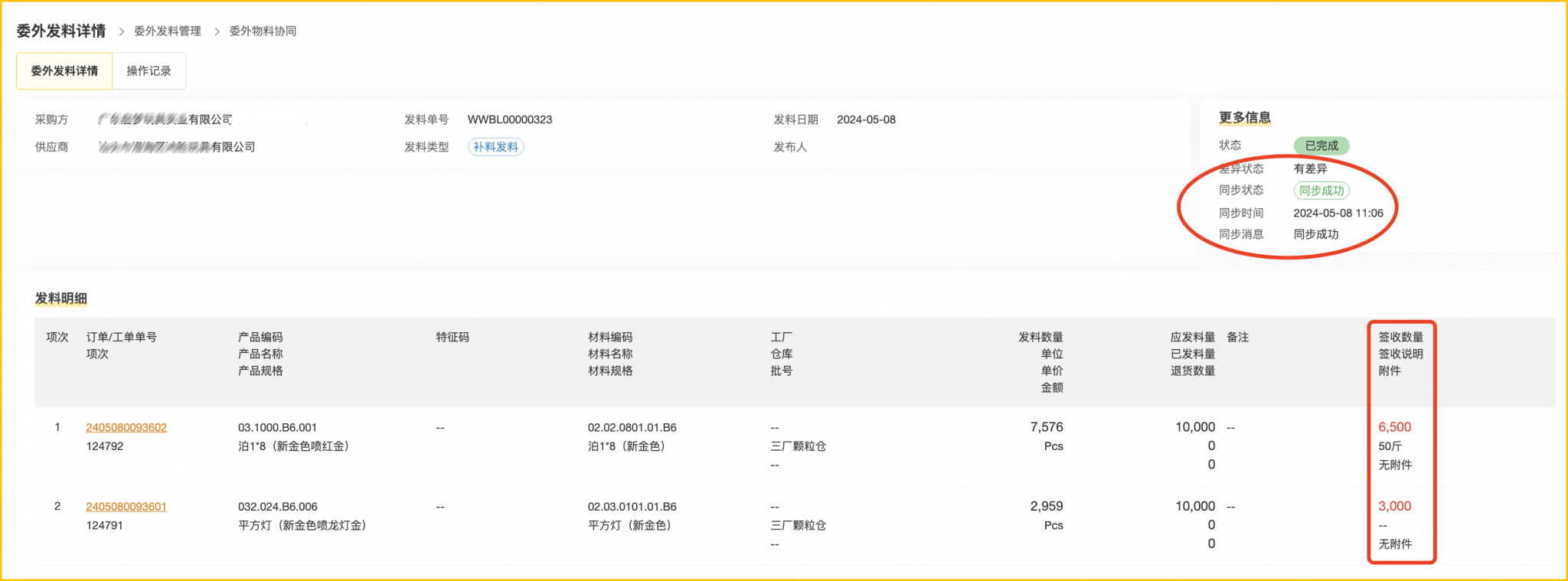 在线确认物料签收数据:在发料上,同步ERP的调拨发料、补料、超耗发料等单据到携客云平台,供应商可在线确认物料签收数据。